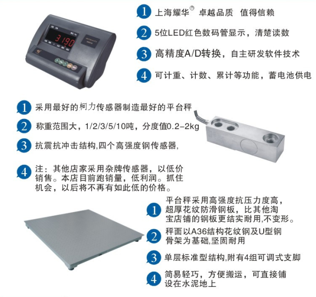 電子式地上衡由稱(chēng)重傳感器、承重臺和稱(chēng)重顯示器組成??梢苑胖迷趫詫?shí)地面上進(jìn)行稱(chēng)量,也可安放在淺基坑上或在其兩側加裝帶有一定坡度的引道,供手推車(chē)稱(chēng)重使用.
